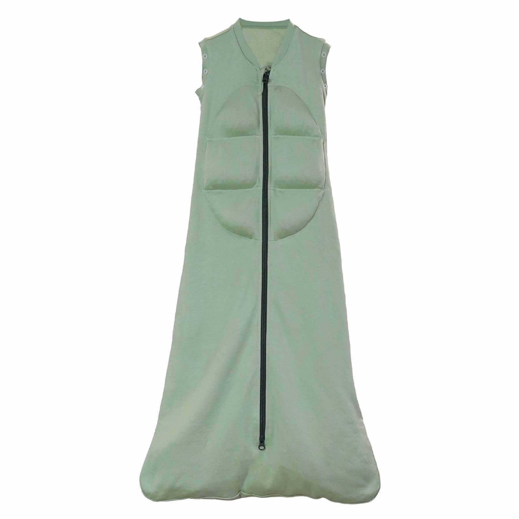 Med det ekstra åndbare bambus-/bomuldsmateriale kan du bruge det vægtede svøb som nattøj og tryghedsgiver. Svøbet er udstyret med en 2-vejs YKK® lynlås, som gør det nemt at skifte ble. Omsluttende funktion opnås ved at lukke trykknapperne ved ærmegabene. Det vægtede svøb har en TOG-værdi på 0,5, hvilket svarer til et tyndt tæppe.
